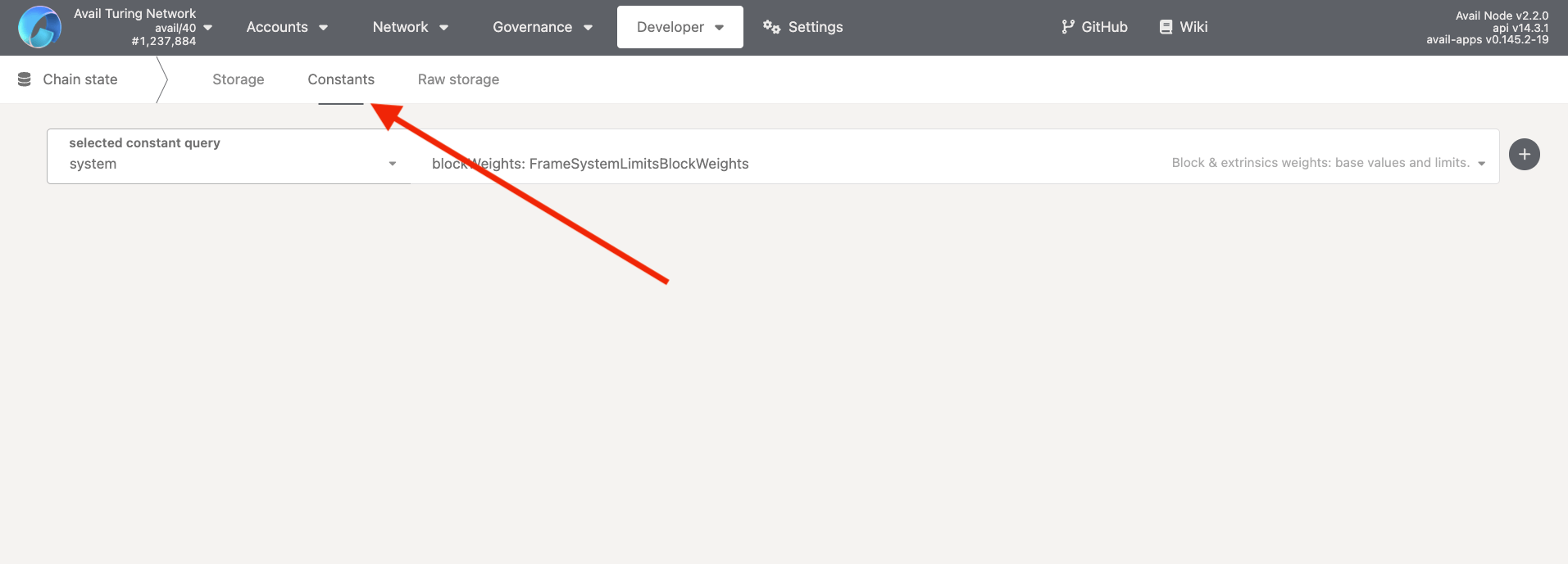AvailAppsexplorer allows you to query the current values of all of it’s runtime constants by going to the constants tab withinDeveloper -> Chain State.