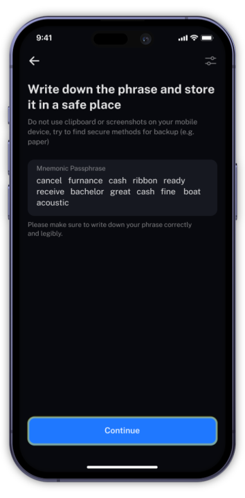 - You will be shown your seed phrase. Make sure to write it down and store it in a safe place.