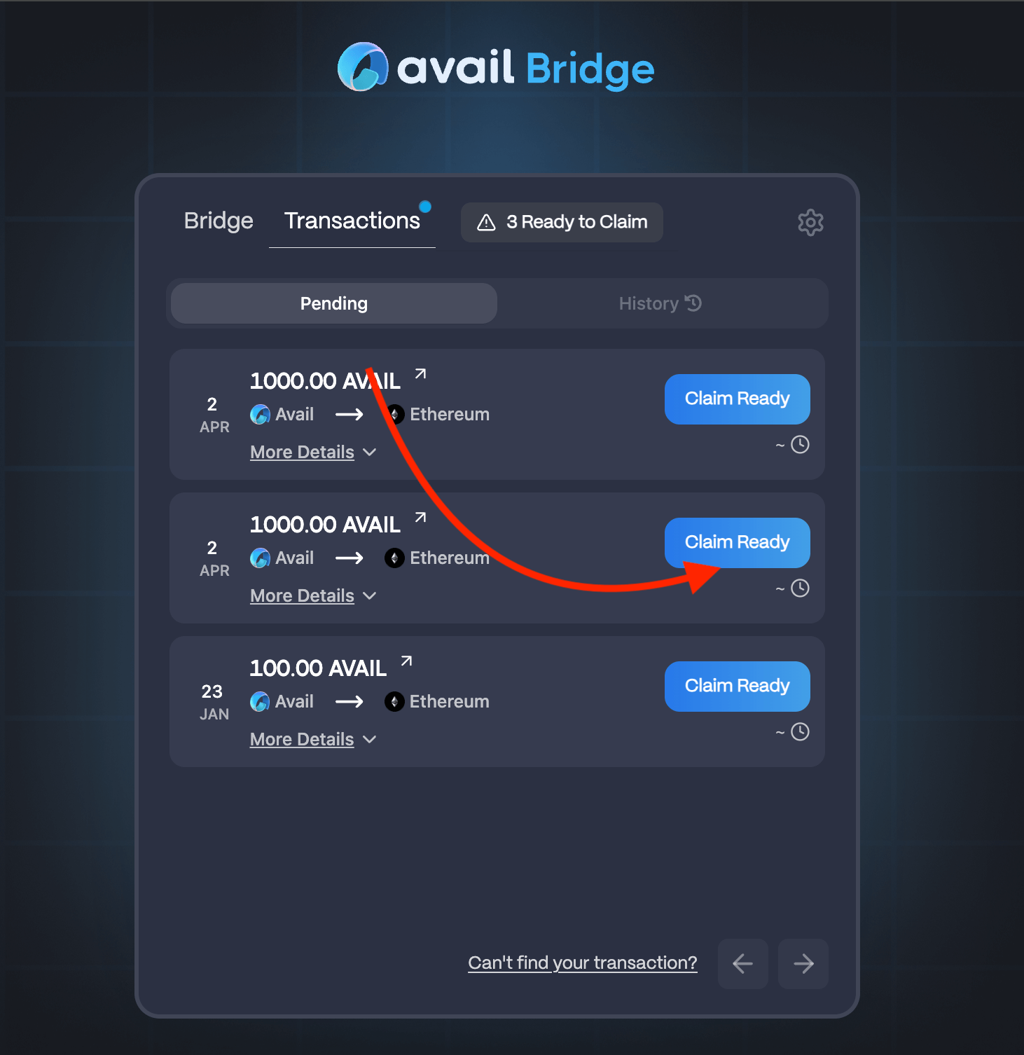 Transactionstab and claim AVAIL by making sure your EVM wallet is connected to Ethereum mainnet, and clicking theClaim Readybutton. Conversely, if you initiate the bridging process from Ethereum and want to claim your AVAIL tokens on Avail DA, make sure your Avail wallet is connected to Avail DA mainnet, and click theClaim Readybutton.