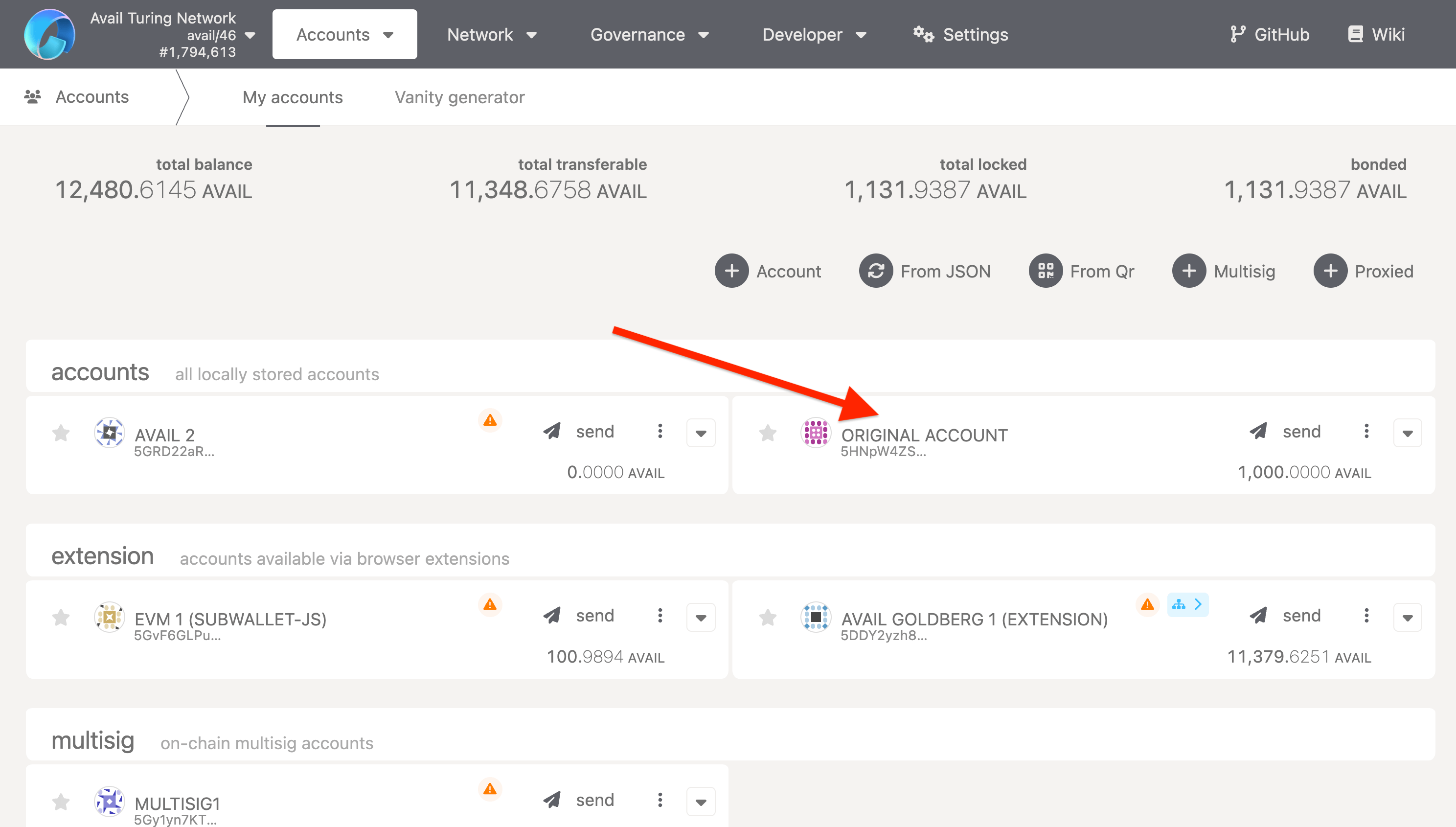 Head on over to the accounts section of the Avail explorer and connect your main account. In my case, I start out with the highlighted account.