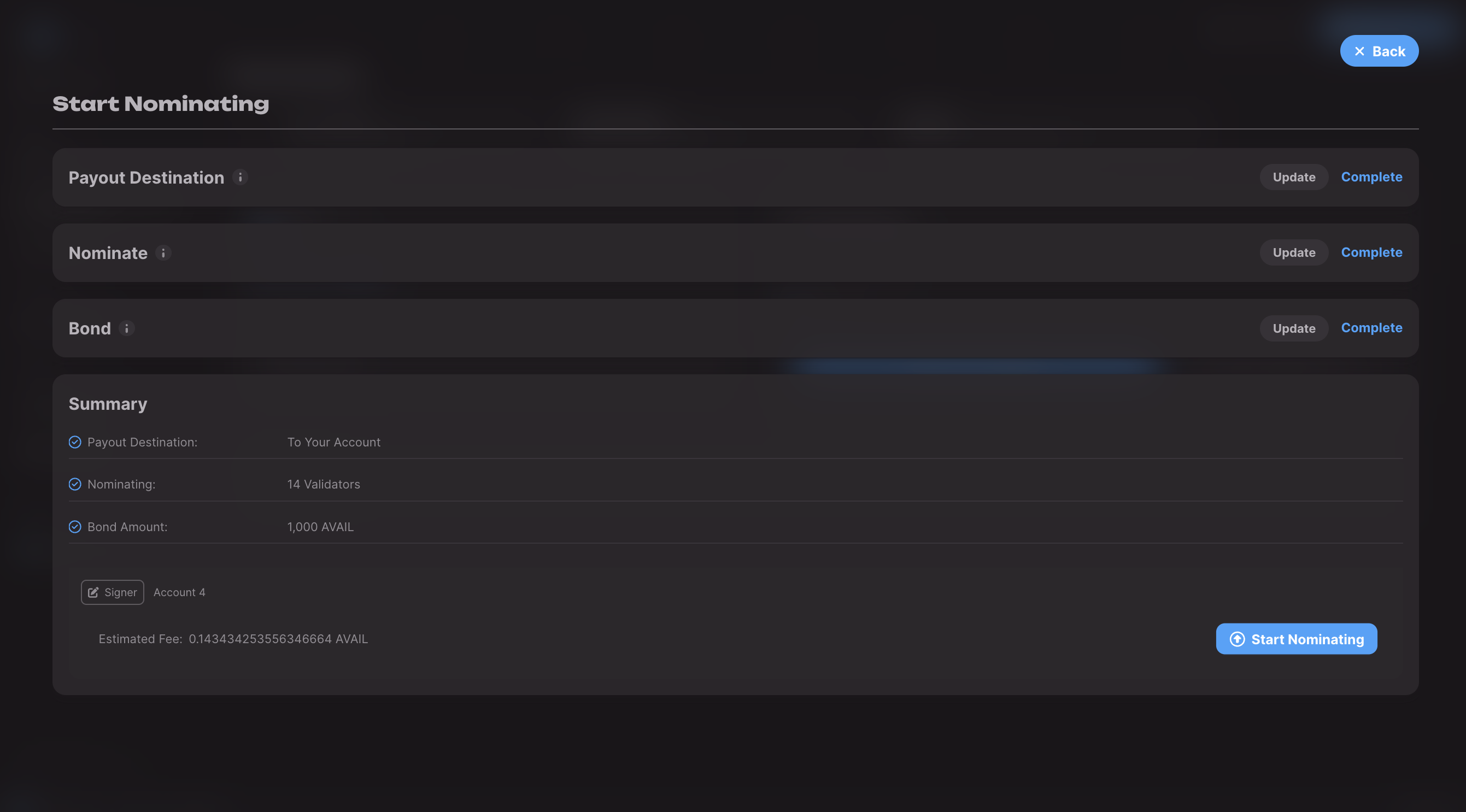 And that’s it! This guide walked you through nominating your AVAIL directly to validators of your choice. Go to the next page to learn how to work with nomination pools.